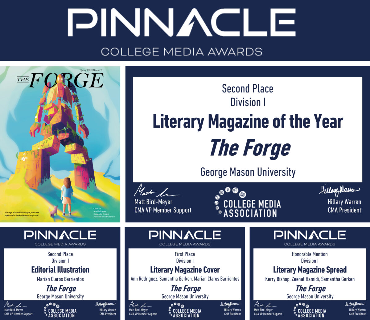 Student Media is proud to announce that The Forge, Mason’s only sci-fi and fantasy magazine, is the winner of multiple 2025 National Pinnacle Awards presented by the College Media Association (CMA)! Winners were announced October 15-18, 2025 at the MediaFest25 Conference in Washington, D.C.